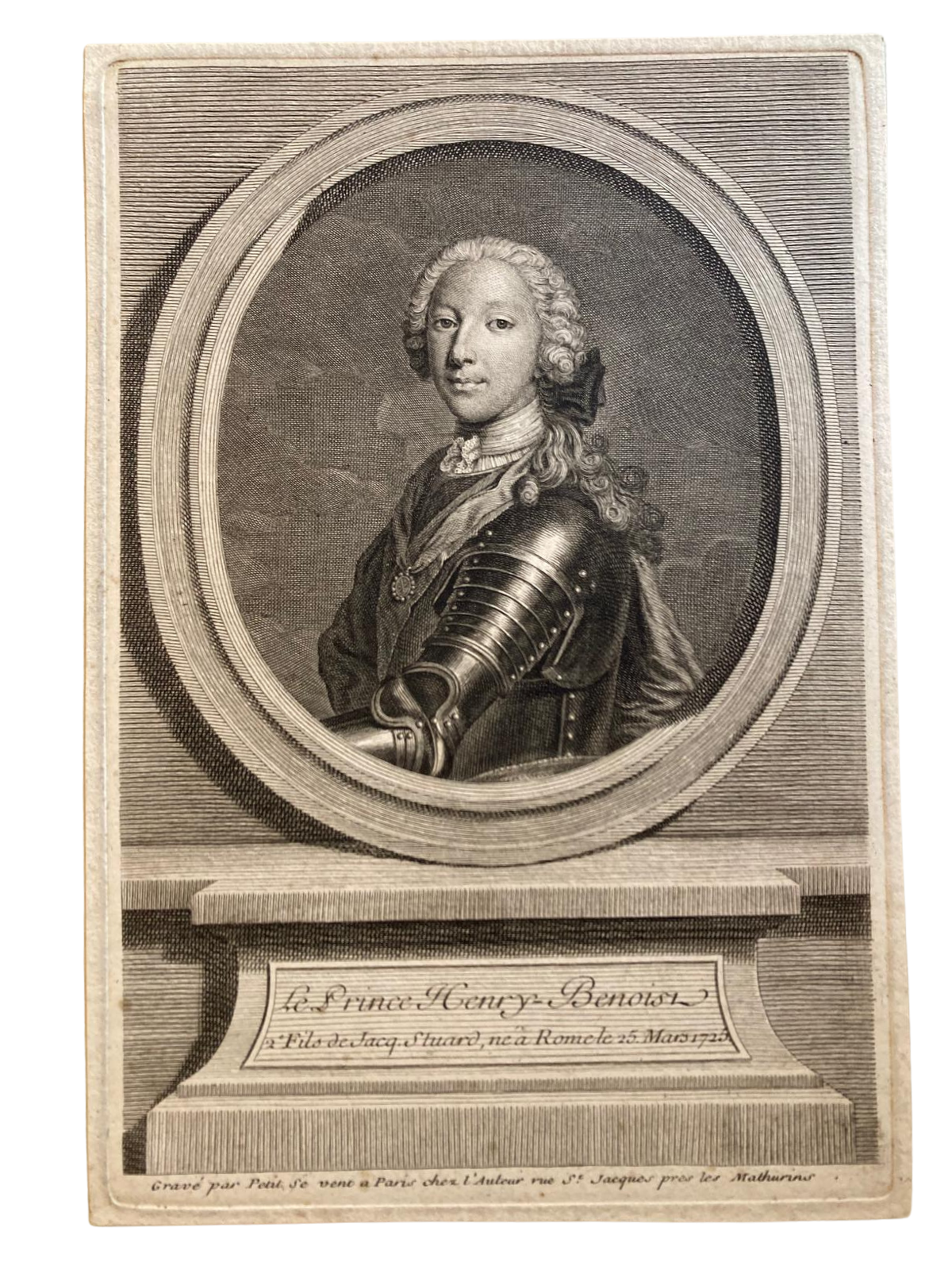 The portraits of the sons of the two princes are after originals by Domenico Duprà (1689–1770), who studied in Rome under Francesco Trevisani and then worked for the courts of the King of Portugal in Lisbon and of the King of Sardinia in Turin. All three original portraits were sent from Rome to be engraved in Paris. The inscription below Charles’ portrait states that the original belonged to Mr. d’Obryen. Daniel O’Brien was for many years King James’ agent in Paris. He joined the court in Rome in 1747 as one of the king’s ministers and was created Earl of Lismore.