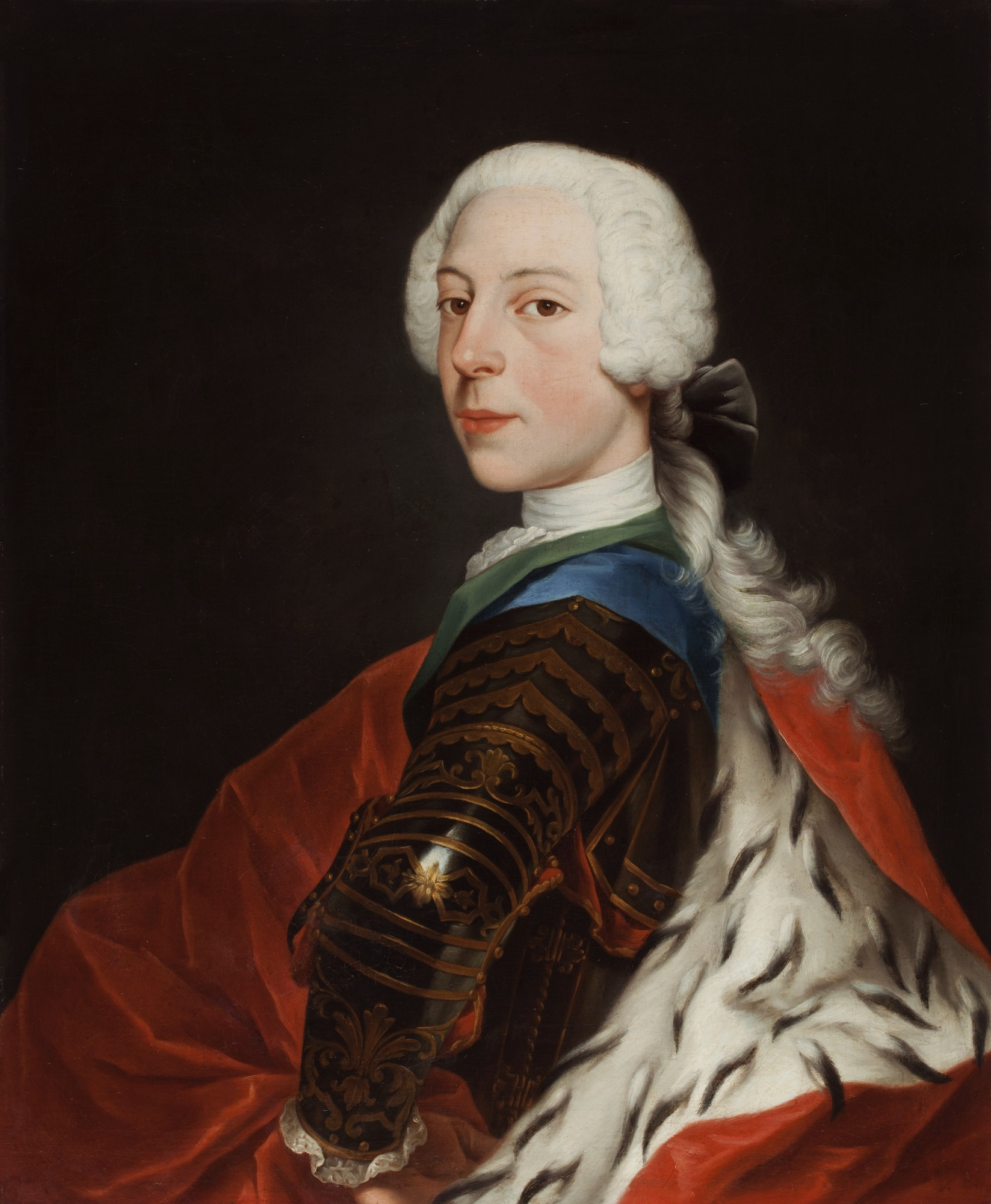 Książę okryty jest obszernym, aksamitnym czerwonym płaszczem podbitym futrem z gronostajów, które podkreśla wysoką rangę portretowanego. Na jego lewym ramieniu widoczna jest błękitna wstęga angielskiego Orderu Podwiązki (św. Jerzego),  a na szyi – zielona wstęga szkockiego orderu Ostu (św. Andrzeja). Obaj synowie Jakuba III/VIII zostali udekorowani tymi najważniejszymi odznaczeniami brytyjskimi już w dzieciństwie.
